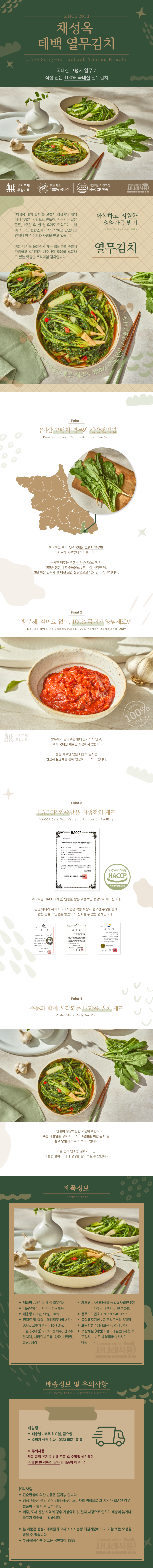• "채성옥 태백 열무김치"는 미리 만들어 저장고에 보관하지 않고 김치의 신선함을 위해 주문 후 수작업으로 만들어 보내드립니다.